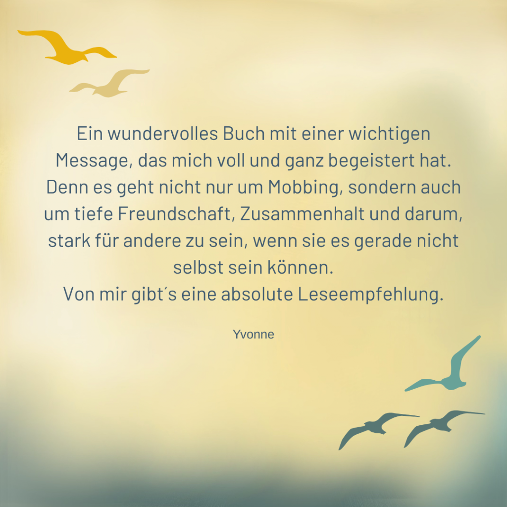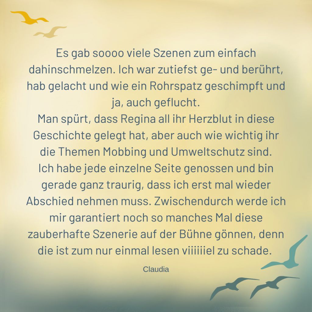 Es gibt Geschichten, da kann ich gar nicht schnell genug am Schreibtisch sitzen, um sie aufzuschreiben. Und dann gibt es Geschichten wie diese. Das zentrale Thema brannte mir zwar unter den Nägeln und ich wollte unbedingt wieder auf die Austernfarm, aber alles in mir sträubte sich. Jetzt, nachdem ich das Wort ›ENDE‹ getippt habe, bin ich ziemlich erleichtert und dankbar, dass ich das Thema Mobbing ganz neu für mich aufgerollt habe. Bei der Recherche hatte ich viele Aha-Momente und ganz unerwartet konnte ich mit einem anderen Blick auf die Vergangenheit sehen. Ich wünschte, die Erkenntnisse, die ich beim Schreiben dieser Geschichte gewonnen habe, hätte ich schon früher gehabt.