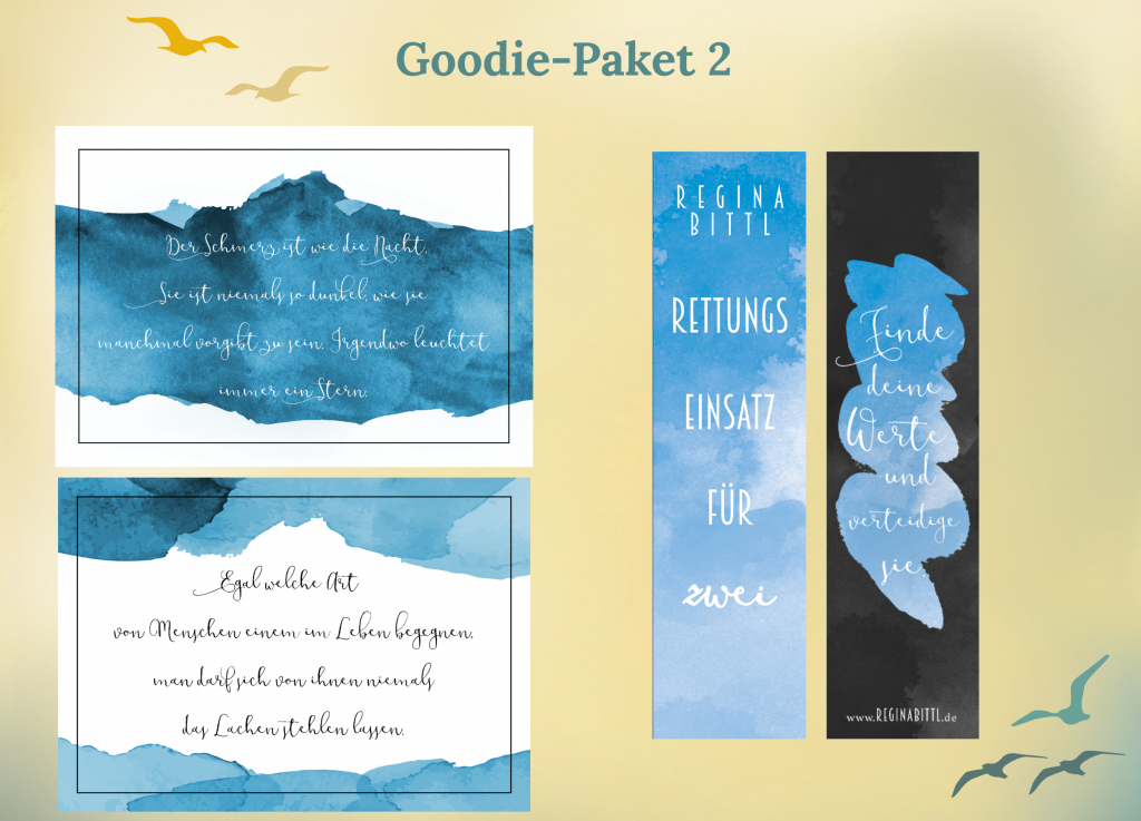 2 Postkarten mit Zitaten aus „Rettungseinsatz für zwei“, 1 Lesezeichen