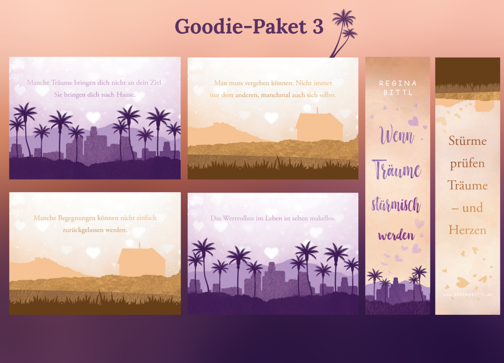 4 Postkarten mit Zitaten aus „Wenn Träume stürmisch werden“, 1 Lesezeichen