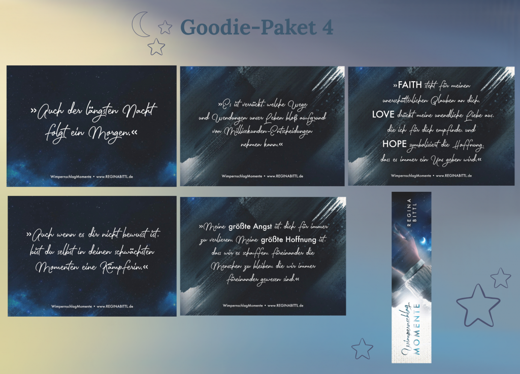5 Postkarten mit Zitaen aus „WimpernschlagMomente“, 1 Lesezeichen